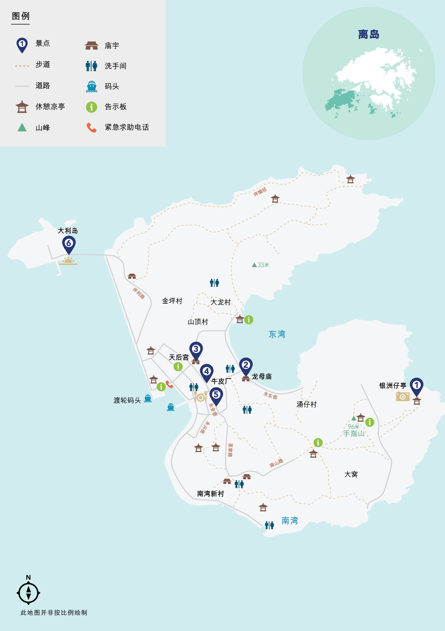 银洲仔亭伫立于坪洲尽头,又有“天涯海角”之称。你只需攀过区区96米高的手指山,再走过小径,就到达银洲仔亭。在这岛上最东边的地方,可以将南丫岛、港岛西边、青马大桥,以至香港迪士尼乐园尽收眼底,享受开扬全景。
