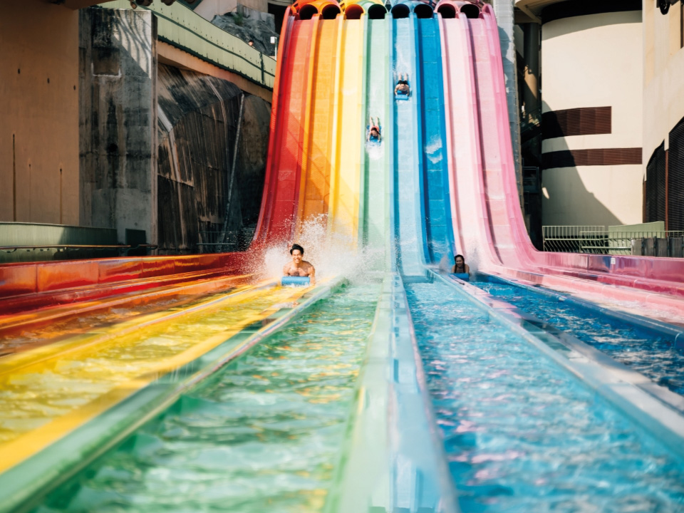 乐园分为5个主要区域,让大家自由选择各式水上活动。当中最刺激的莫过于 “绝岭深谷”,为胆大的勇者而设,一系列惊险体验,如 “极速回环” 的重力挑战、“深谷飞瀑” 的自由落体、“勇者之巅” 的开放式滑道及 “冲天瀑布” 的滑梯,一定令你心跳加速!而另一区域“跃动流域”,让大家可以体验 “旋风双子梯” 和 “急转双子梯” 的旋转急弯所带来的快感、多滑道的 “八彩天梯” 与 “神秘迷冲” 的巨型滑道。